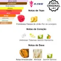 Notas de Topo: Framboesa 🍓, Raspas de Limão 🍋, Flor de Laranjeira 🍊🌸